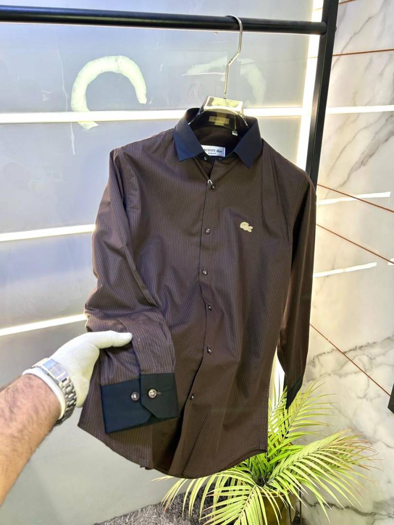 Lacost e Logo Lining Dark Brown Premium Oxford Lycra Shirt F3224-BR